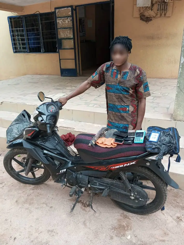 Speaking on the arrest, the spokesperson for the state police command, Funmi Odunlami, who confirmed the arrest, said items recovered from him include “a black unregistered TVS ladies motorcycle, one cut to size gun with bullets, six mobile phones and a PoS machine.”