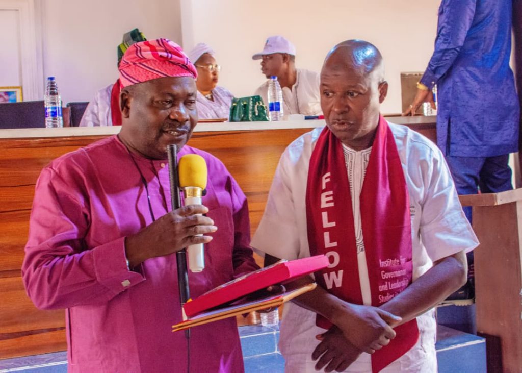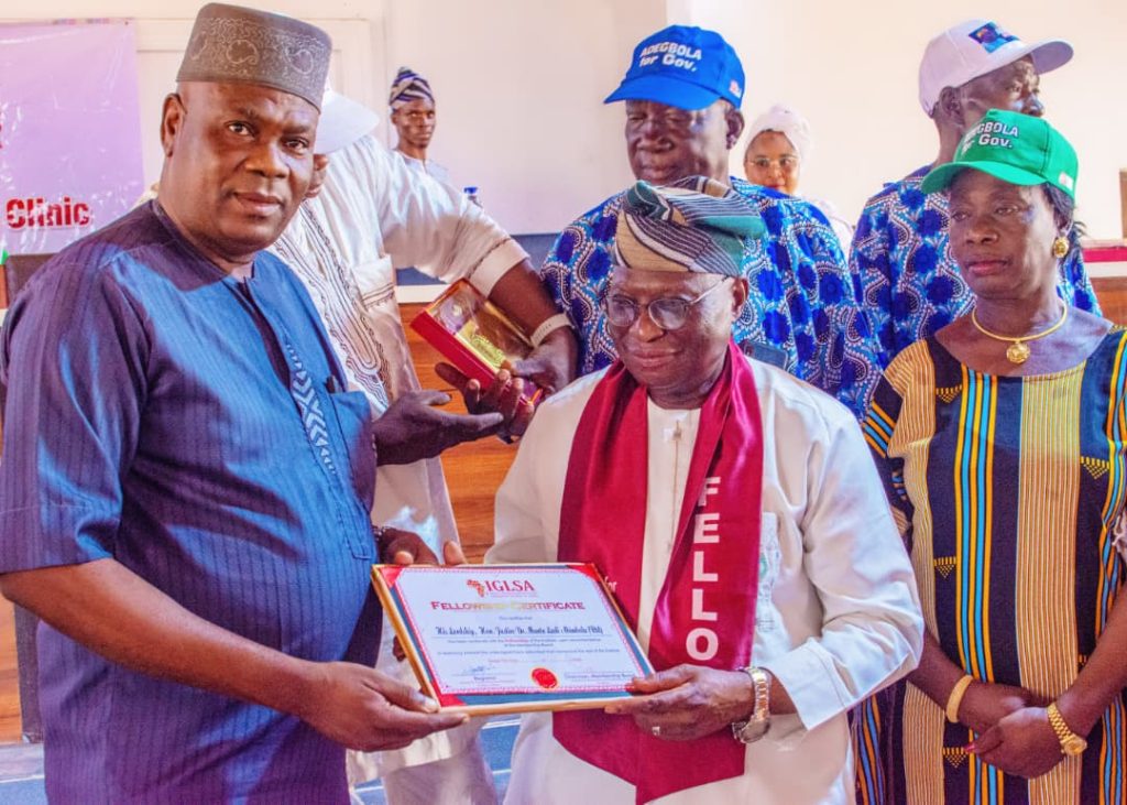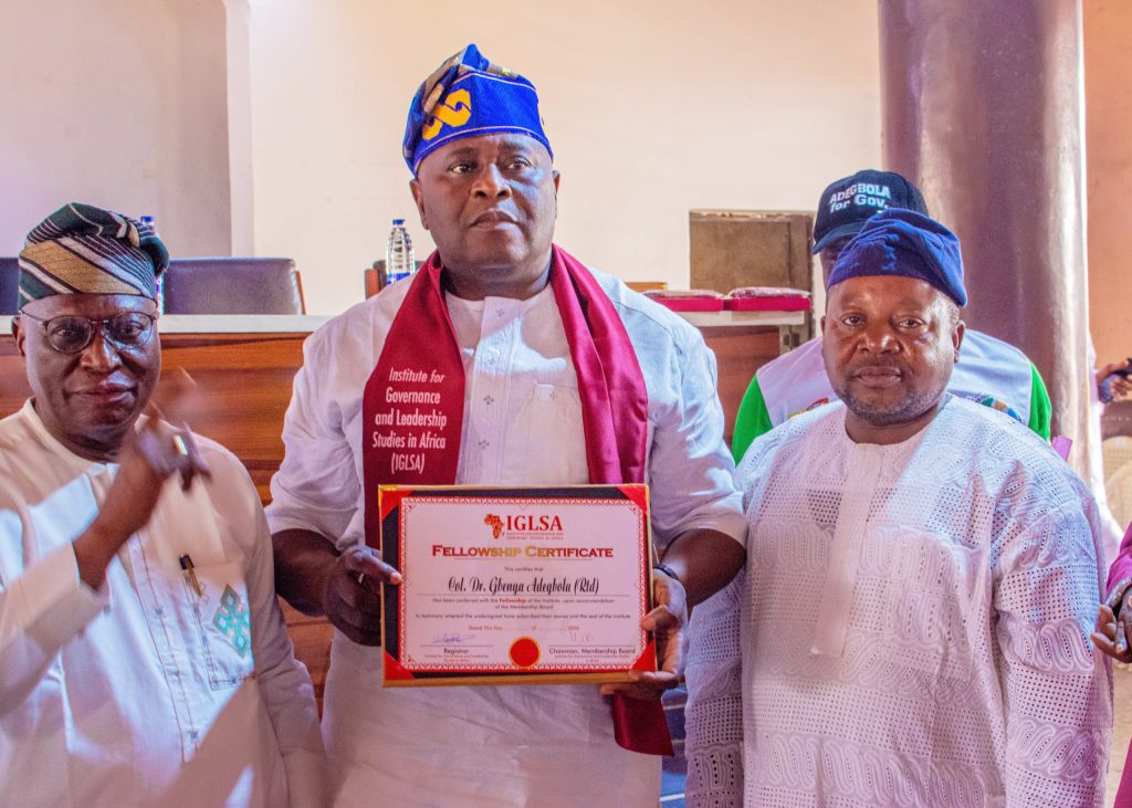 Col. (Dr) Gbenga Adegbola (rtd), aspiring to become the next Oyo State Governor in 2027 was among eminent personalities from Saki and environs conferred with the Fellowship Award of the Institute for Governance and Leadership Studies in Africa – IGLSA, at the close of a leadership training course organised by the institute for oke-ogun youths in Saki over the weekend.